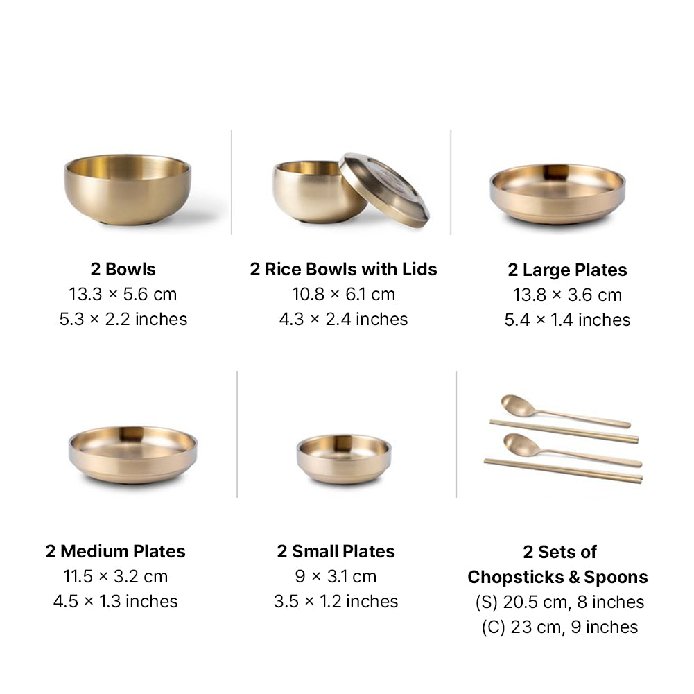 Size: (2 Bowls) 13.3 x 5.6 cm, 5.3 x 2.2 inches / (2 Rice Bowls with Lids) 10.8 x 6.1 cm, 4.3 x 2.4 inches / (2 Large Plates) 13.8 x 3.6 cm, 5.4 x 1.4 inches / (2 Medium Plates) 11.5 x 3.2 cm, 4.5 x 1.3 inches / (2 Small Plates) 9 x 3.1 cm, 3.5 x 1.2 inches / (2 Spoons) 20.5 cm, 8 inches / (2 Sets of Chopsticks) 23 cm, 9 inches
