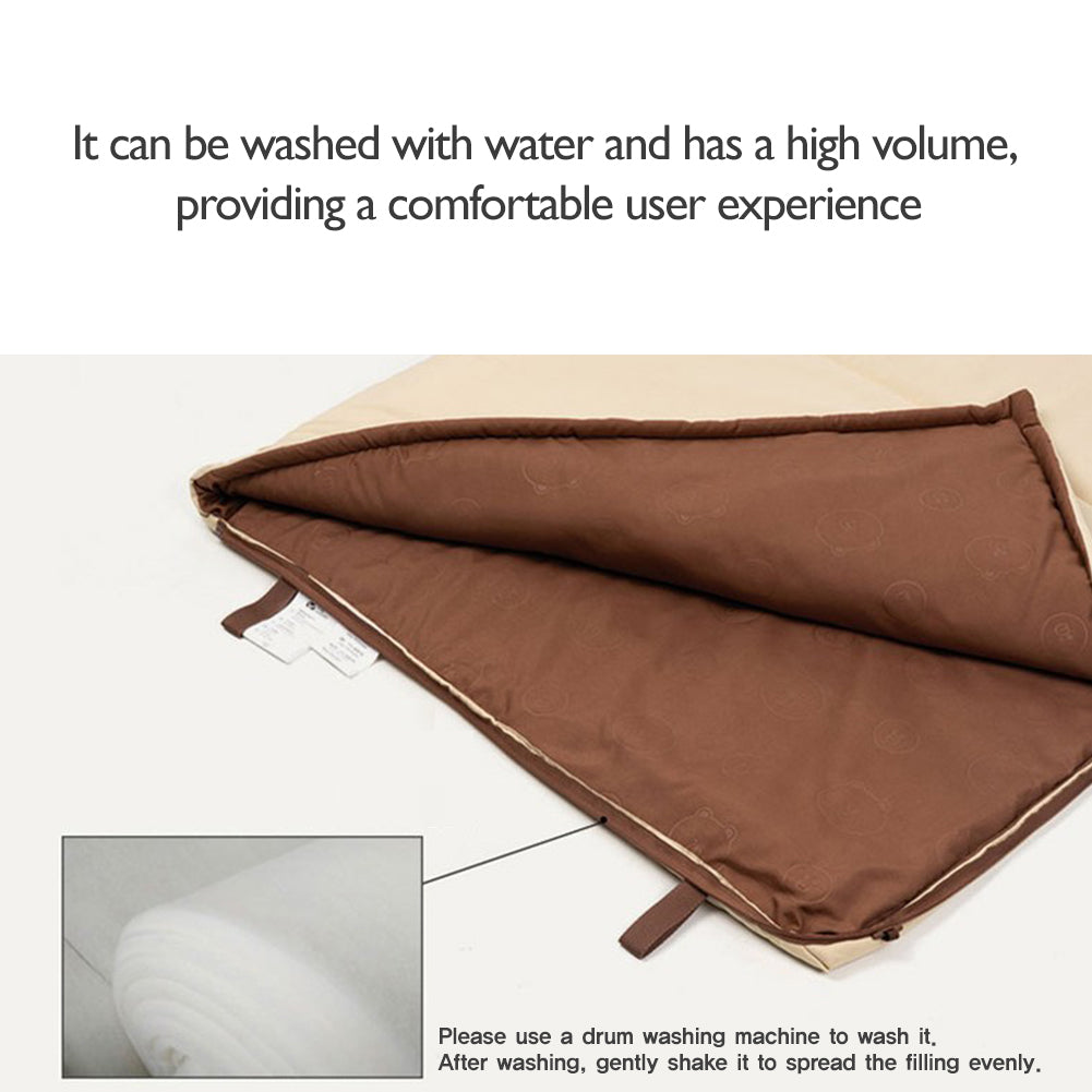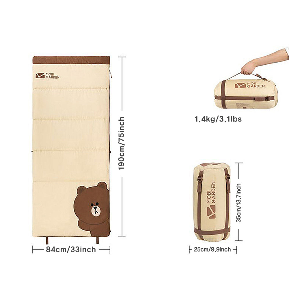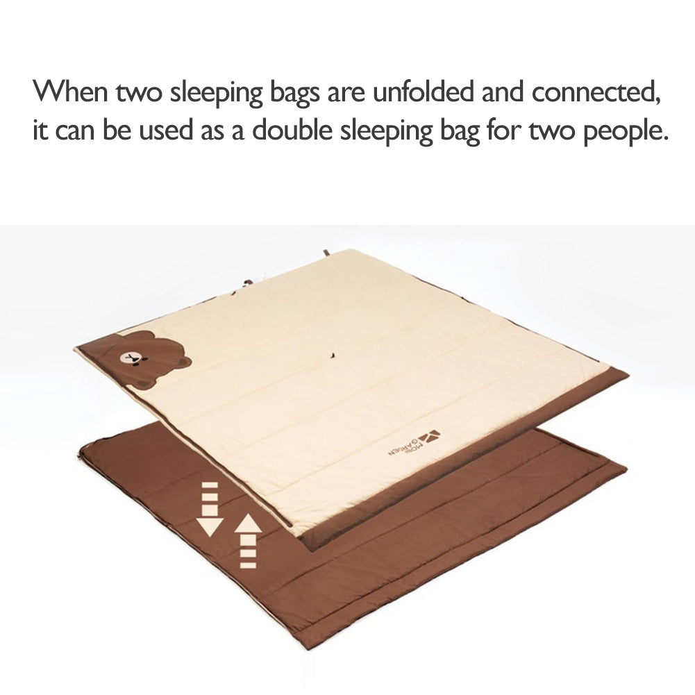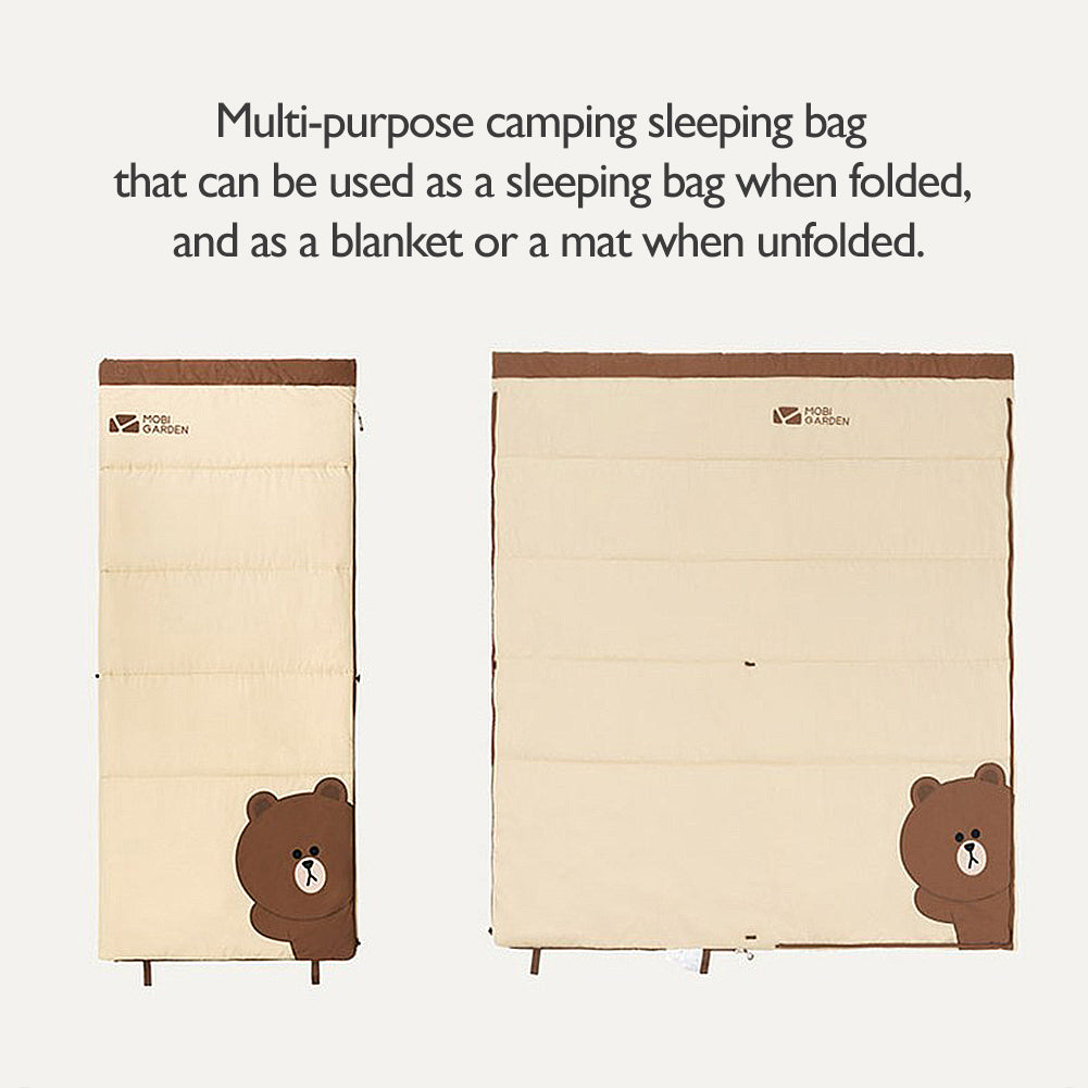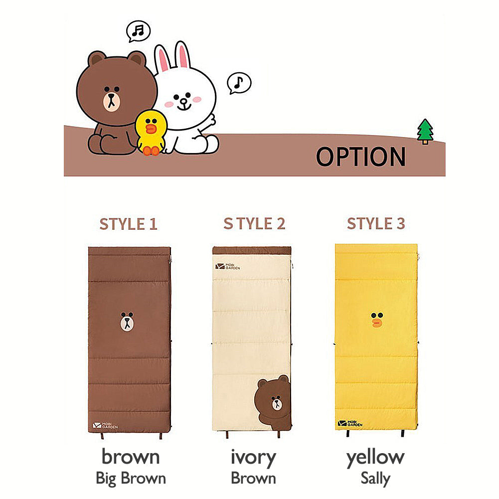 - Three types of sleeping bags with Big Brown, Brown, and Sally characters are available in three color options, respectively Brown, Ivory, and Yellow.