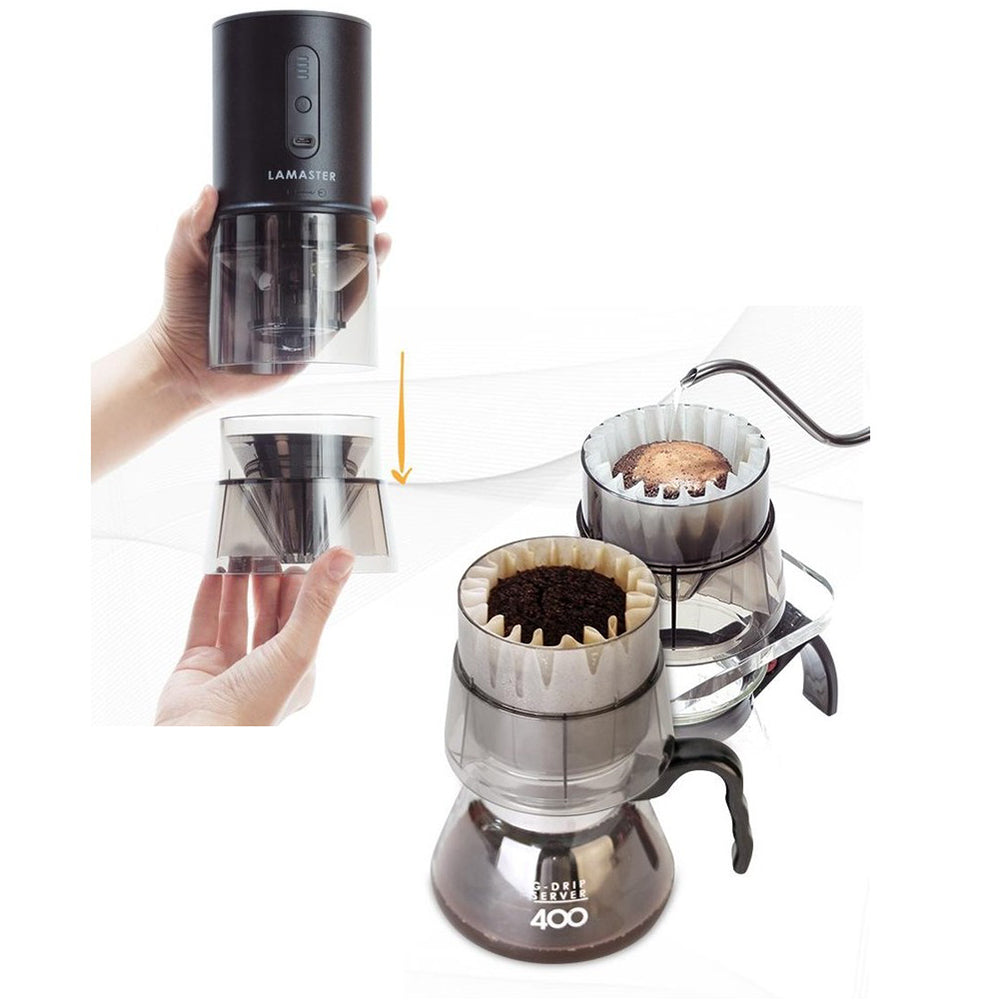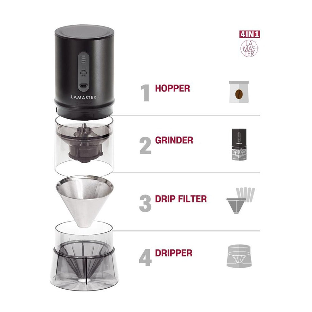 Basic components: Main body grinder dripper drip filter (for 1-2 people) charging cable