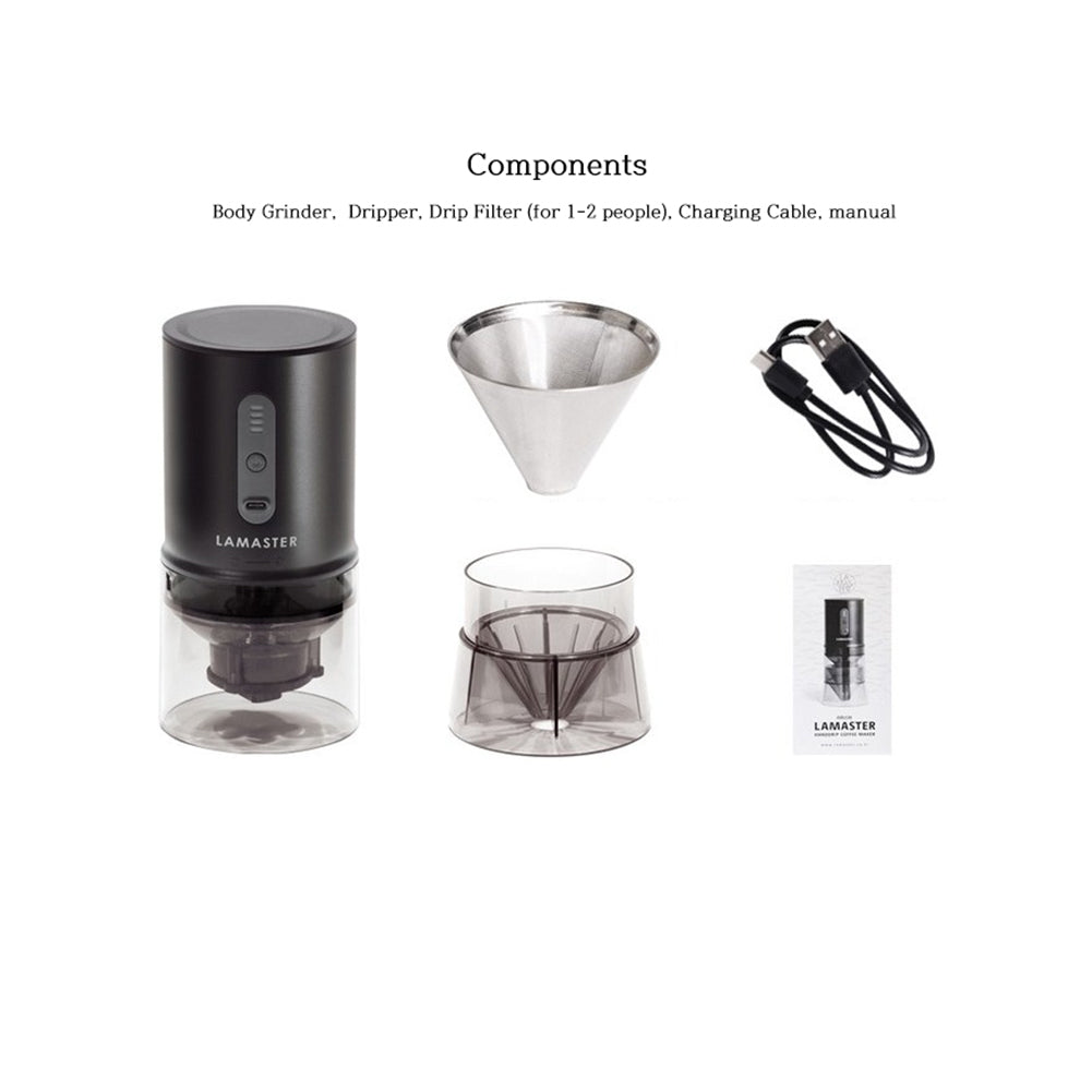 Components: Body Grinder, Dripper, Drip Filter (for 1-2 people), Charging Cable, manual