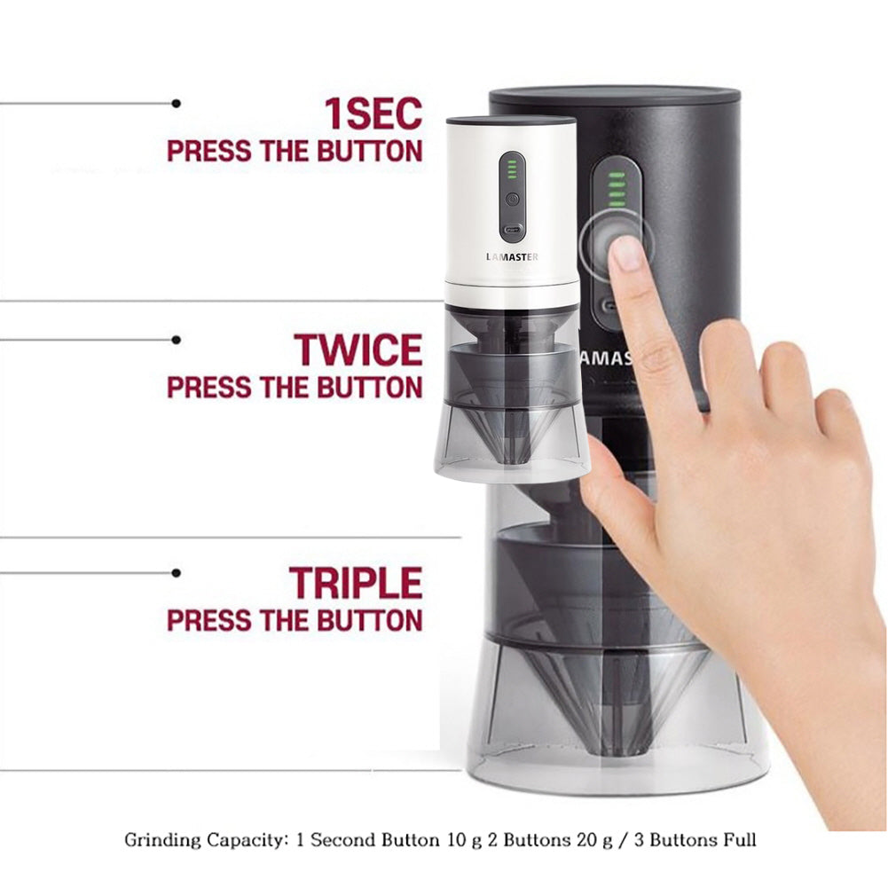 Grinding Capacity: 1 Second Button 10 g 2 Buttons 20 g / 3 Buttons Full Rated Input/Output: INPUT 100-240V, 50-60Hz, 2A/7.4V, 2A