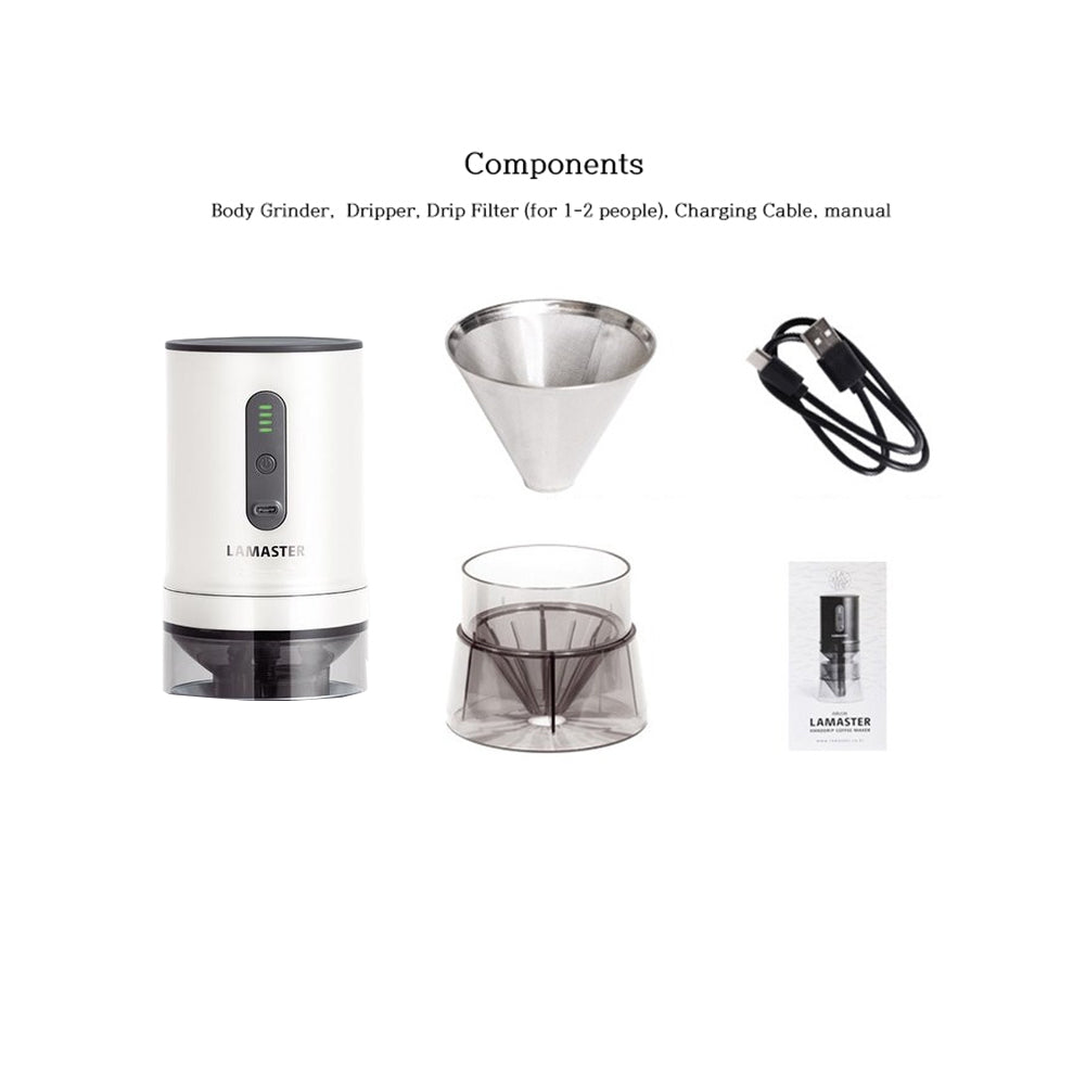 Components: Body Grinder, Dripper, Drip Filter (for 1-2 people), Charging Cable, manual