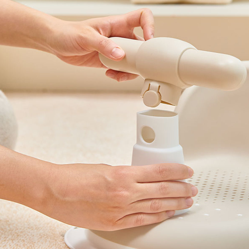 2. The bath chair is equipped with a handlebar to support your baby’s upper body comfortably. This allows your baby to sit upright independently, giving you both hands free to wash your child easily. The handlebar can also be detached quickly with a simple button press, making it convenient to seat or lift your baby.