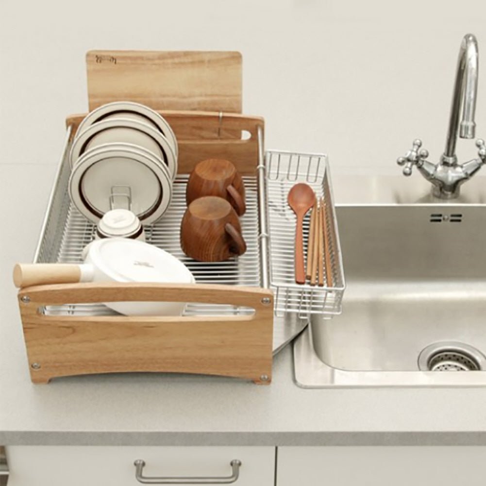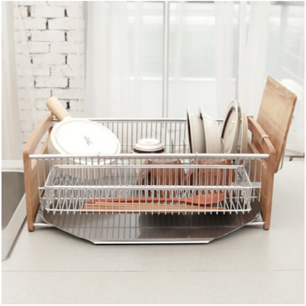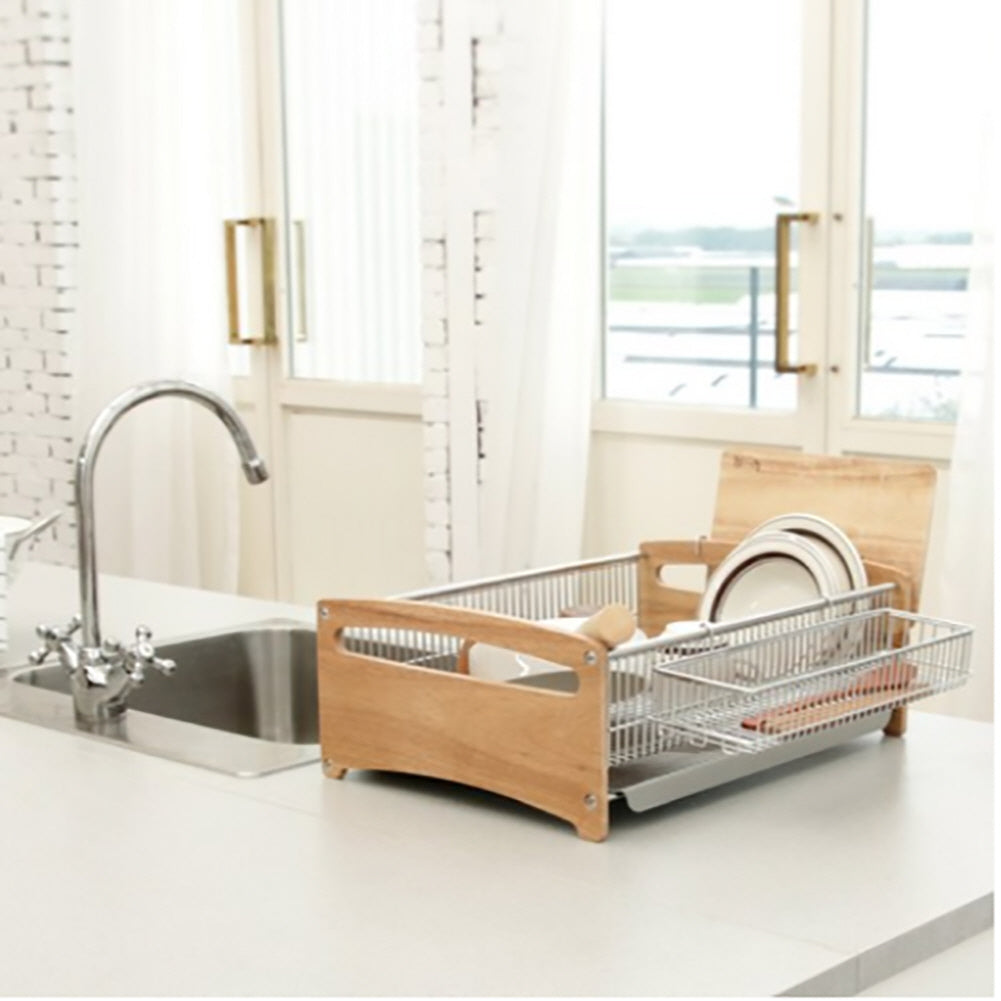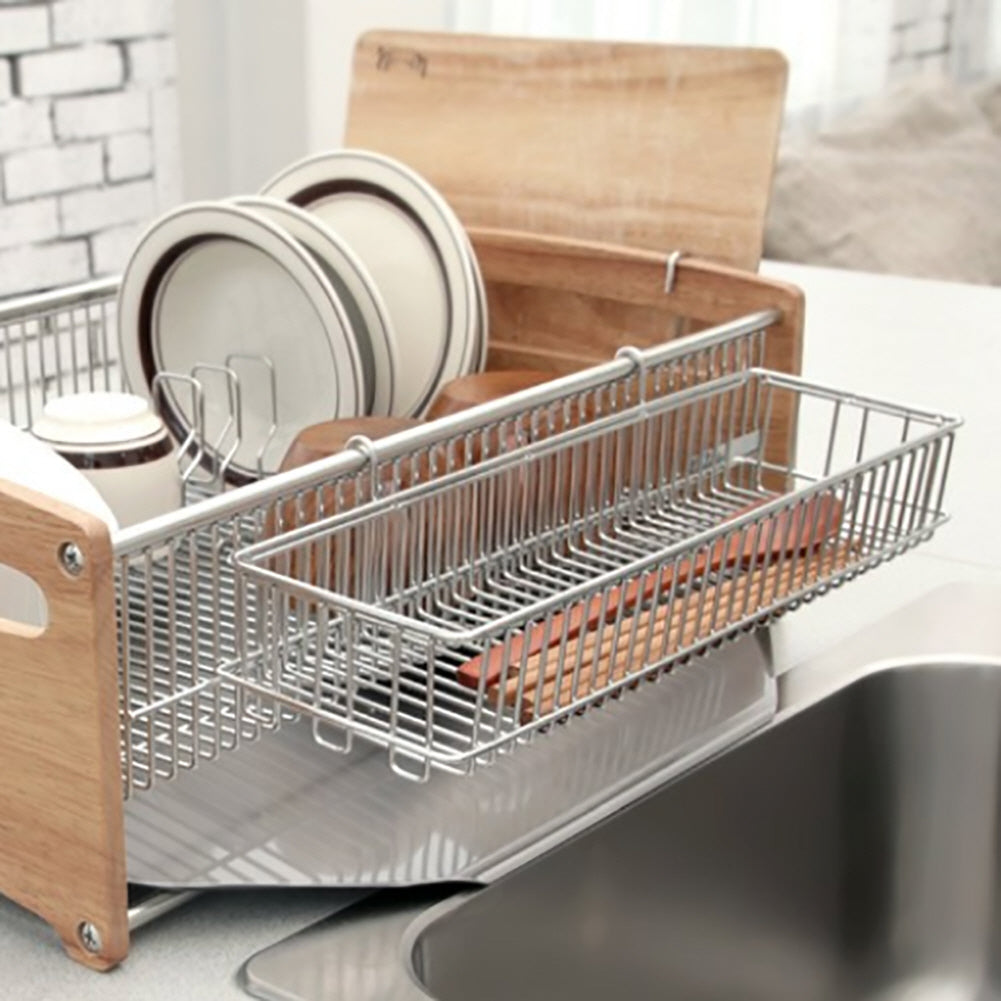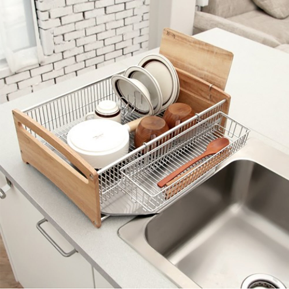 Baum Stainless Steel side bamboo Dish Dry Rack Drying Drainer Kitchen Holder Organizer 17.9 x 12.5 x 6.4 in