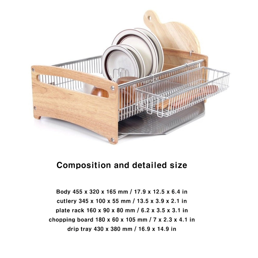 - Components: main body, cutlery box, plate holder, cutting board holder, drip tray
