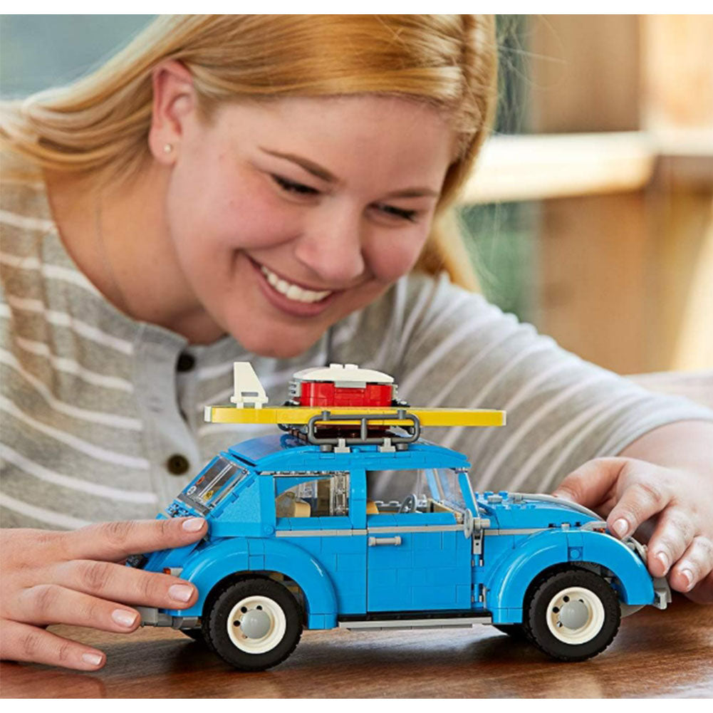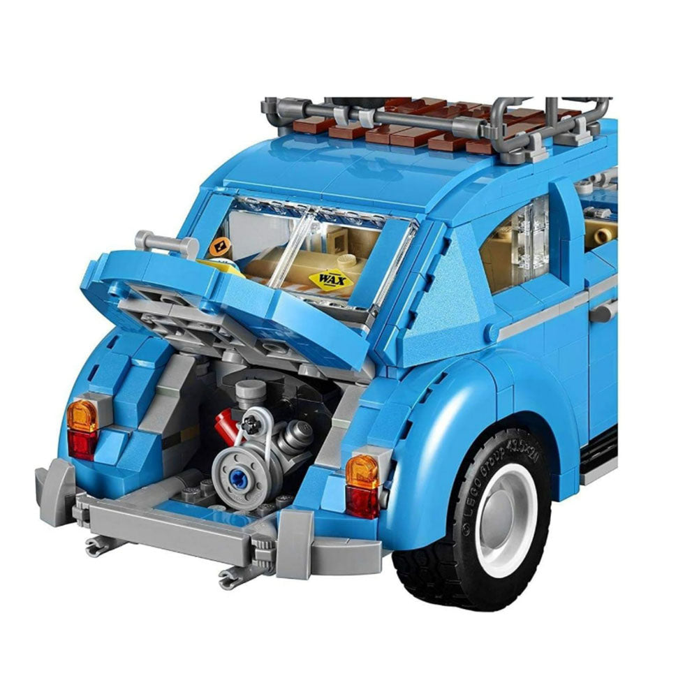 Celebrate the iconic VW Beetle with this awesome LEGO Creator Expert reproduction. This detailed model comprises a number of special features and elements that help recreate the distinctive Beetle characteristics, including an azure-blue color scheme, curved fenders, flat windshield, VW logo, and an authentic 4-cylinder air-cooled engine and fuel tank. The accessible interior features beige-colored, forward-tilting seats, dashboard and steering wheel, and the roof-mounted surfboard and a cooler box can be removed. This car construction set has been designed to provide a challenging and rewarding building experience with a touch of nostalgia.