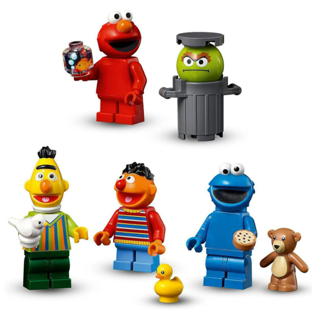 The set features Elmo, Cookie Monster, Bert and Ernie minifigures, plus Oscar the Grouch and Big Bird figures; Also includes Slimey the Worm, Dorothy the Goldfish, Radar the Teddy Bear and Rubber Ducky figures