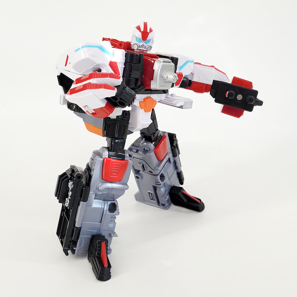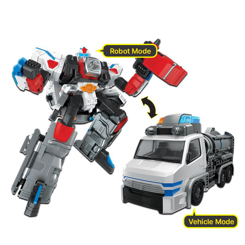 3. In robot mode, it features a weapon that shoots disinfectant, staying true to the sanitation robot concept. The head is designed like a gas mask, so even just looking at the head and weapon, it’s immediately clear that this is a sanitation robot.