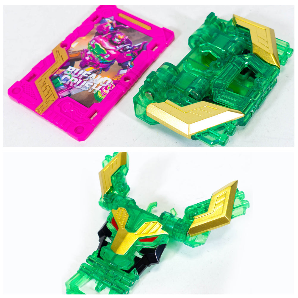 4. BUFALO CRUSH also comes with a Weapon Card that transforms into the Buffalo Plate! This buffalo-themed armor piece attaches to the robot's chest, with translucent green parts adding an air of mystery. Covering the torso, it intensifies BUFALO CRUSH's powerful appearance. Faithful to the animation, this design is sure to captivate young fans and provide endless enjoyment.
