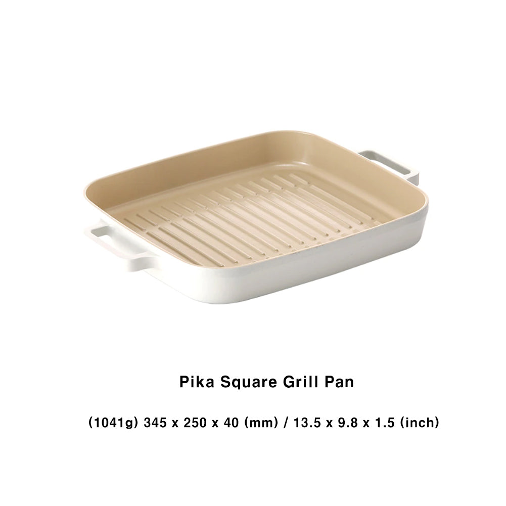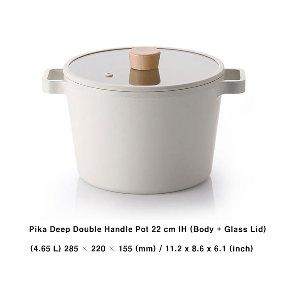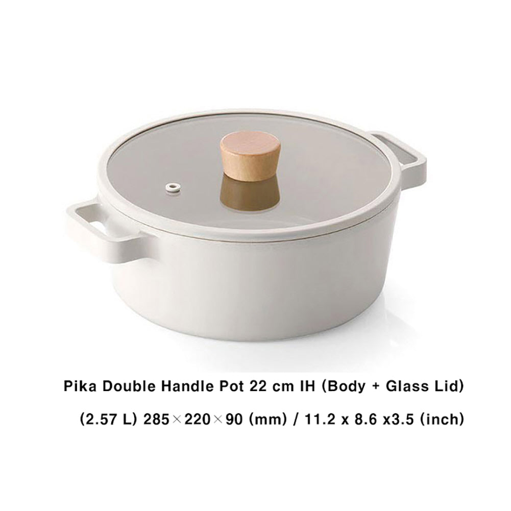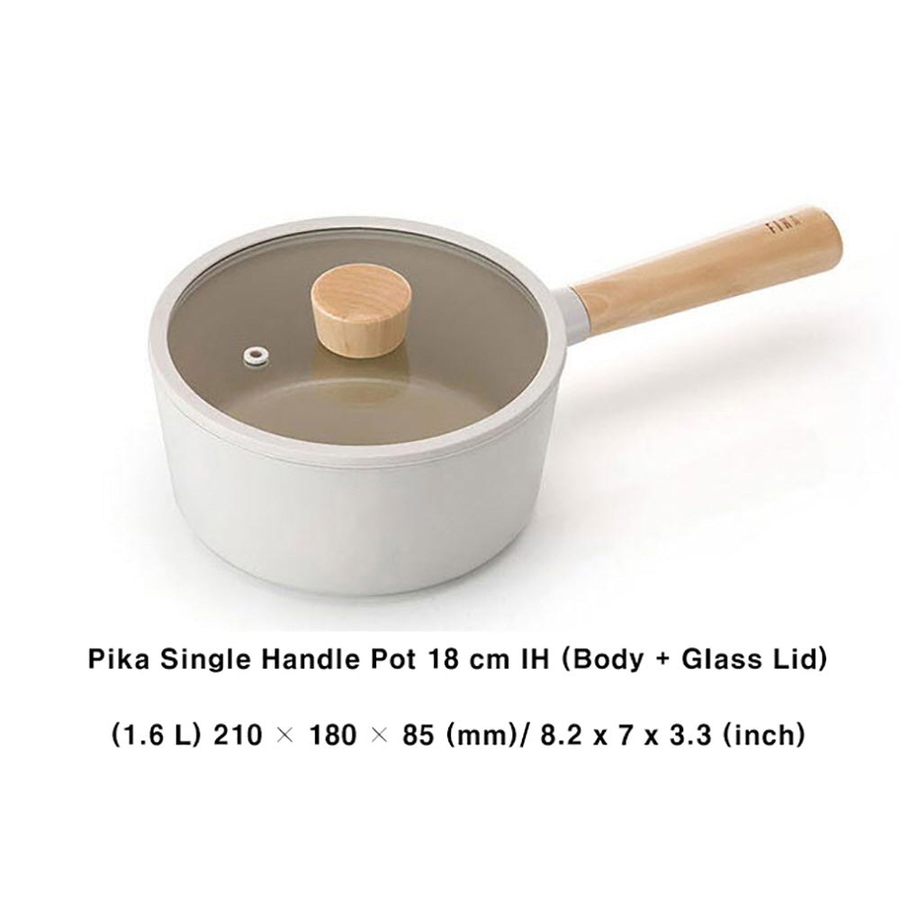 Pika Square Grill Pan :(1041g) 345 x 250 x 40 (mm) / 13.5 x 9.8 x 1.5 (inch)Pika Single Handle Pot 18 cm IH (Body + Glass Lid) :(1.6 L) 210 × 180 × 85 (mm) / 8.2 x 7 x 3.3 (inch)Pika Deep Double Handle Pot 22 cm IH (Body + Glass Lid) :(4.65 L) 285 × 220 × 155 (mm) / 11.2 x 8.6 x 6.1 (inch)Pika Double Handle Pot 22 cm IH (Body + Glass Lid) :(2.57 L) 285×220×90 (mm) / 11.2 x 8.6 x3.5 (inch)