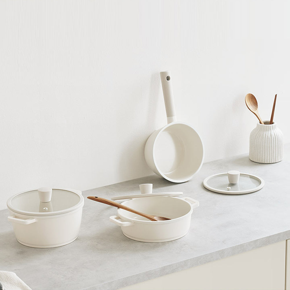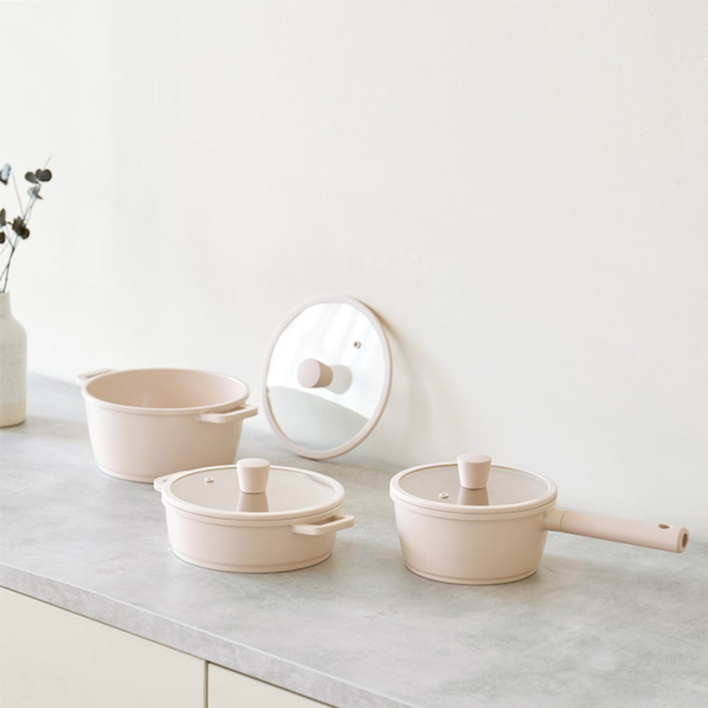 1. Introducing a beautiful cookware set! With its understated and sophisticated design, it offers a natural yet modern touch to your kitchen. This set includes three pieces of cookware in popular kitchen sizes: 18cm/7inch and 20cm/7.8inch.