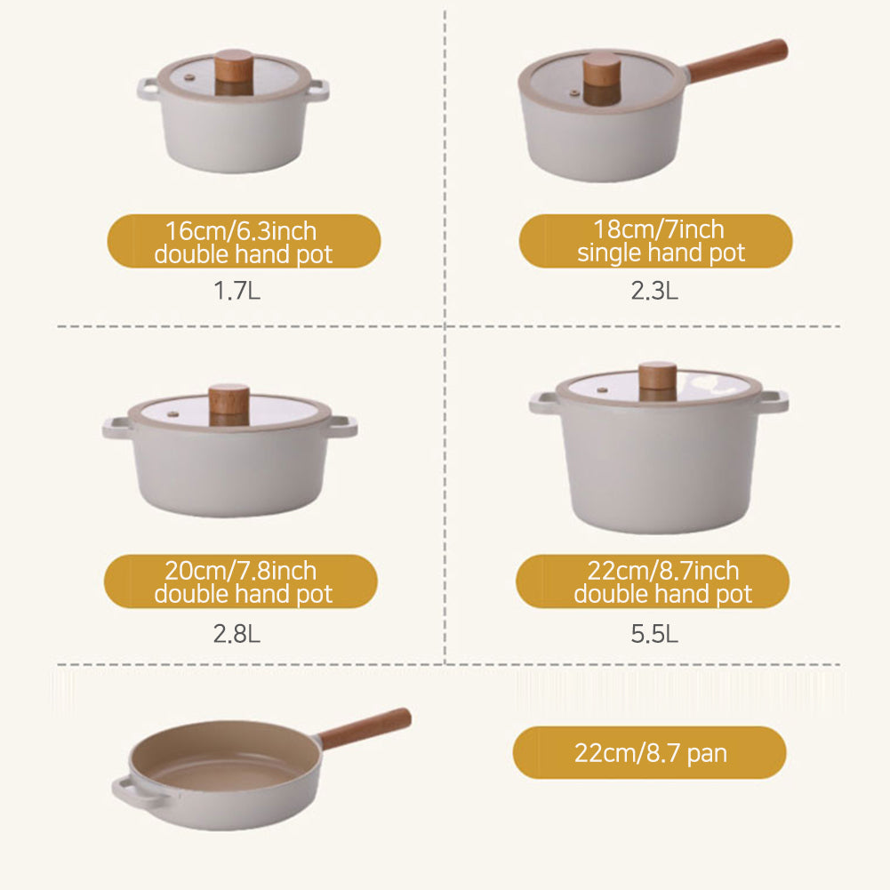 Components: 16cm/6.3inch double hand pot, 18cm/7inch single hand pot, 20cm/7.8inch double hand pot, 22cm/8.7inch double hand pot, 22cm/8.7 pan