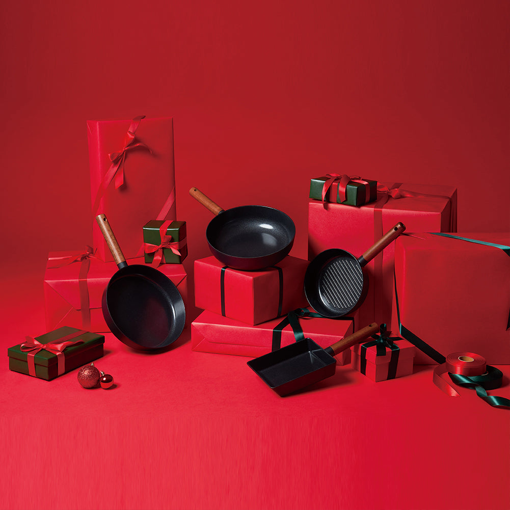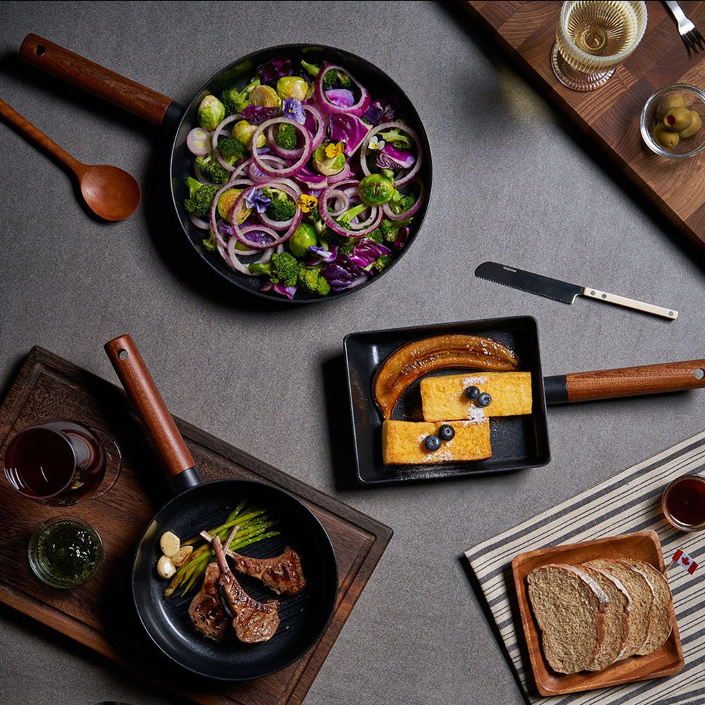 2. The pans are made of aluminum die-casting material in a stylish black color. The premium handle is crafted from highly durable premium maple wood, making it a sophisticated addition to your kitchen. You can easily transition from the gas stove to the dining table, creating an elegant tableware setting.